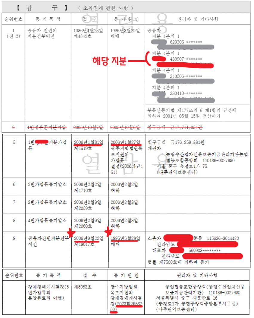 2) ★2006년1월27일★ 채무자A 지분 1/4 재산 가압류 결정(농협)