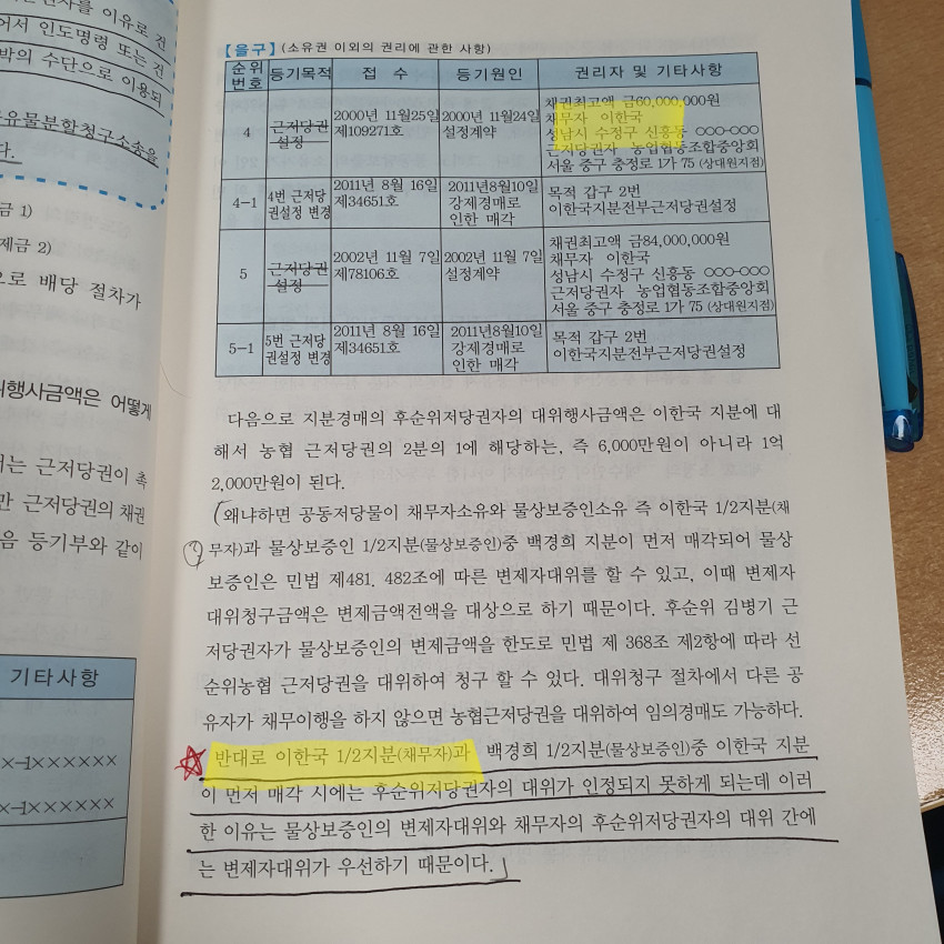 이부분에서 채무자2분의1지분이 먼저 경매시, 자신의 지분에서 전제 선순위저당권이 다 변제된다하면.. 굳이 물상보증인의 변제자대위가 생길 이유가없을텐데..